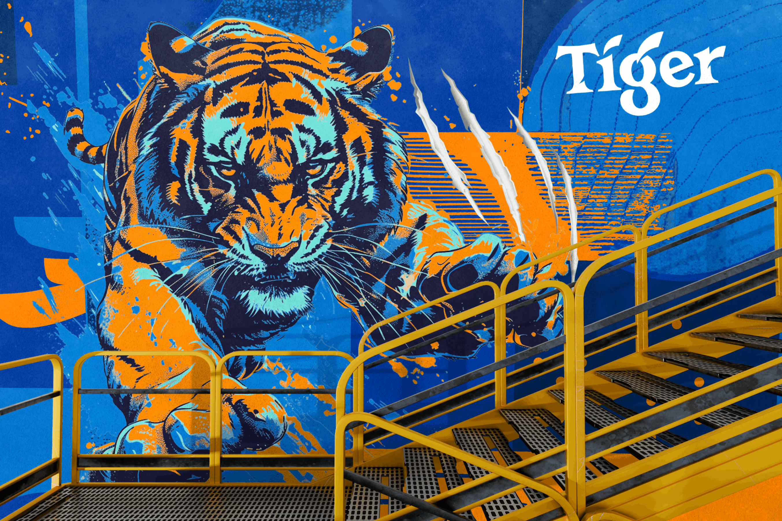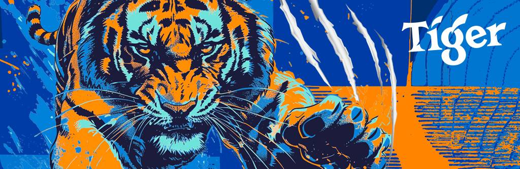 For the Tiger wall, we started with a tight system before introducing any expression. A three-colour palette electric blue, vivid orange, and high-contrast white anchored everything. Beyond that, the illustration style, halftone textures, and graphic overlays all had to operate within a single visual language.